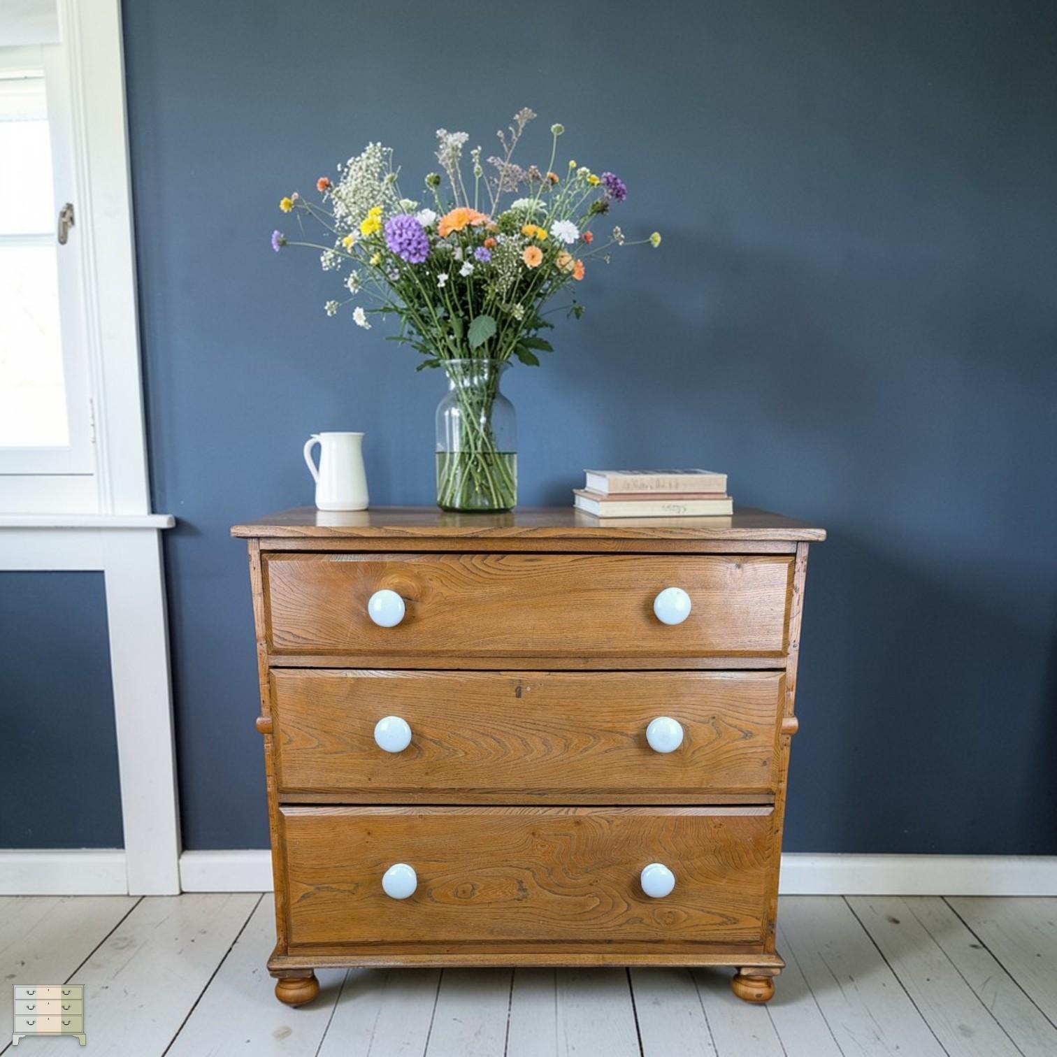 An Edwardian oak chest of drawers, featuring three graduating drawers each with a pair of white porcelain knobs. Standing on later added turned feet.