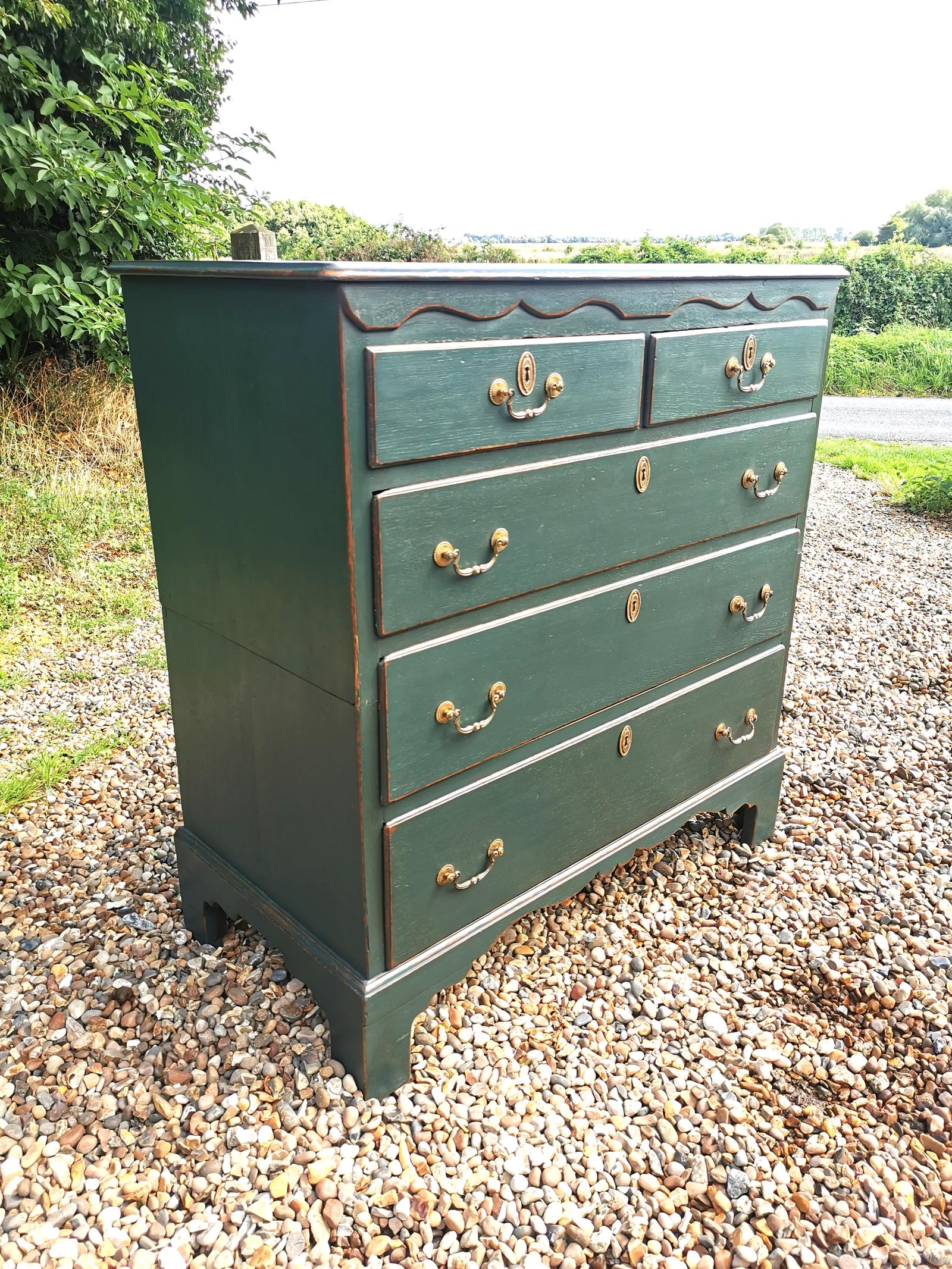 This is a late 18th Century painted country oak ‘Norfolk’ chest of 5 drawers. Standing on cut bracket feet with brass swan neck handles and decorated escutcheons. Made in two halves to accommodate a cottage staircase.